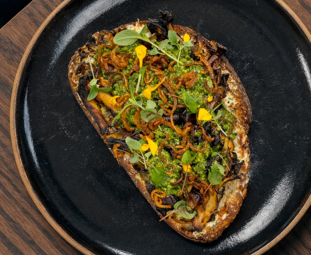 His dish, Maitake Mushroom Toast, layers green garlic pistou, smoked and herbed ricotta, and crispy shallot on Publican seeded rye. Earthy, grounded, and quietly expressive, it reflects how Sebastian cooks: attentive to season, texture, and what is already there.